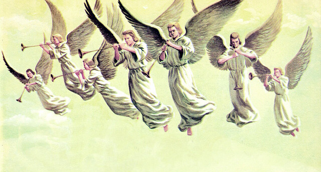 " Toen zag ik hoog langs de hemel een engel vliegen. Hij riep luid: "Vreselijk! Vreselijk! Wat zal het een vreselijke tijd worden voor de mensen op aarde, als de laatste drie engelen op de laatste drie trompetten blazen! " - Openbaring 8:13 BB