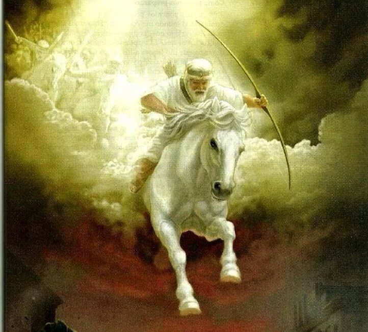Bijbeltekst: " Ik zag dit: het lam verbrak een van de zeven zegels en ik hoorde een van de vier wezens roepen met een geluid als een donderslag: “Kom!” Ik zag dit: een wit paard met een ruiter, die een boog droeg. Hij kreeg een zegekrans en trok op als een overwinnaar, de overwinning tegemoet."- Openbaring 6:1-2