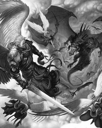 " Toen begon er in de hemel een oorlog. Want Michaël en zijn engelen streden met de draak en zijn engelen. 8 De draak en zijn engelen werden verslagen. Ze mochten niet meer in de hemel blijven. 9 De grote draak werd op de aarde gegooid. Hij is de oude slang en wordt ook wel de duivel of de satan genoemd. Hij is het die de mensen ongehoorzaam maakt aan God. Hij werd samen met zijn engelen op de aarde gegooid. " - Openbaring 12:7-9 BB